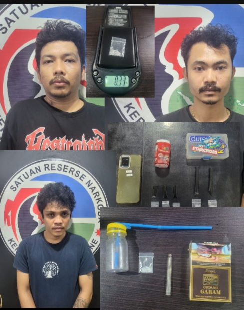 Tiga pelaku tersebut diringkus saat sedang melakukan pesta sabu bersama. Polisi menyita sejumlah barang bukti dalam penggerebekan tersebut diantaranya, satu paket satu ukuran kecil, satu batang pirex kaca yang masih ada sisa sabu didalamnya dan satu buah korek api gas lengkap dengan jarum sumbunya.
