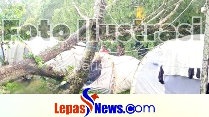 Menurut saksi mata, angin kencang yang datang secara tiba-tiba membuat pohon di sekitar lokasi tidak mampu bertahan hingga akhirnya tumbang dan menimpa bagian atas tenda.